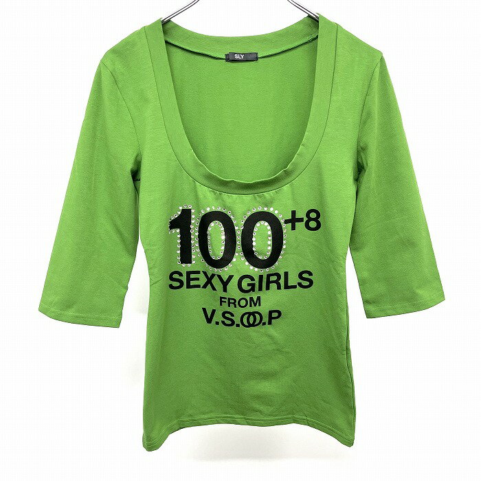 【楽天スーパーSALE限定!! \★35%OFF★/対象商品|12月4日(木)20時00分〜12月11日(木)01時59分まで】【中古】スライ SLY Tシャツ 5分袖 Uネック ラインストーン SEXY GIRS プリント ストレッチ 日本製 綿×ポリウレタン M ヘザーグリーン レディース