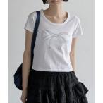 tシャツ サイドギャザーリボンラインストーンロゴTシャツ レディース