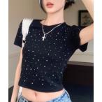 tシャツ 秋SALE激安中/ラインストーンショートトップス レディース