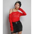 tシャツ ラインストーンロゴサイドギャザーオフショルリブトップス レディース