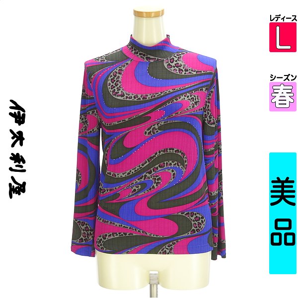 \14周年感謝祭★15%OFFクーポン/ イタリヤ 伊太利屋 カットソー プルオーバー レディース 春 長袖 パープル L ラインストーン入りプッチ柄カットソー 【中古】【古着】【セール】