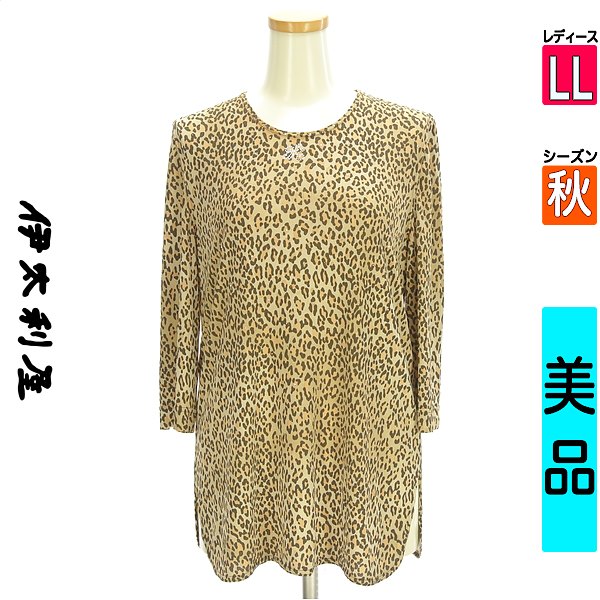\14周年感謝祭★15%OFFクーポン/ イタリヤ 伊太利屋 カットソー プルオーバー レディース 秋 長袖 ベージュ LL ラインストーン入りレオパード柄カットソー 【中古】【古着】【セール】