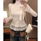 tシャツ ドット柄ハーフネック切り替えレースTシャツ レディース