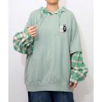 tシャツ 353112:ネコとラビルのチェック柄切替フーデッドプルオーバー レディース