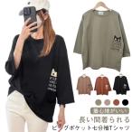 Tシャツ 七分袖 ビッグポケット付き 猫柄 7分袖tシャツ レディース トップス ラウンドネック カットソー ゆったり カジュアル シンプル ナチュラ