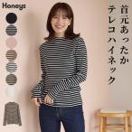 トップス Tシャツ ロンT 長袖Tシャツ カットソー 長袖 ハイネック テレコ素材 綿混 無地 ボーダー柄 レディース Honeys ハニーズ テレコハイネックT