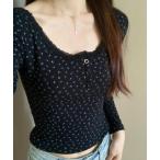 tシャツ 小花柄ソフト長袖Tシャツ フラワーレースヘンリーネックピチT レディース
