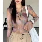 tシャツ さりげなく個性的。フィンガーホール付柄シアーメロートップス レディース