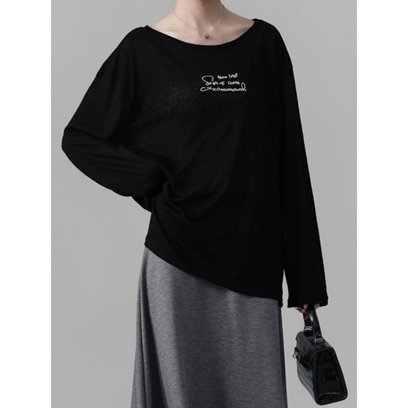 Tシャツ レディース 長袖 クルーネック 黒 テンセル綿混 ゆったり しわになりにくい リラックスフィット インナー 無地 カジュアル 秋 ルームウェア