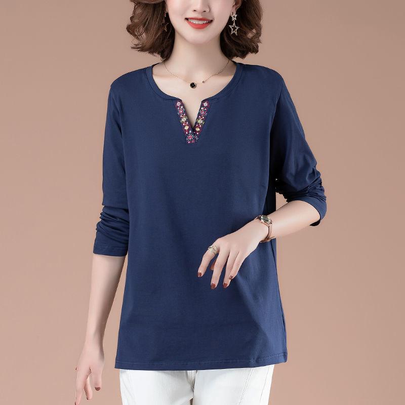 Tシャツ レディース Vネック 長袖 トップス プルオーバー ミセス カットソー 幾何学模様 花柄 無地 切り替え 普段使い ゆったり 婦人服 ブラック レッド ブルー