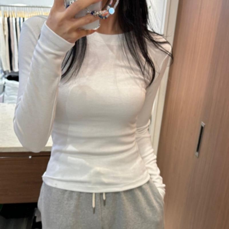 Tシャツ レディース 秋冬 無地 長袖 スリムフィット 裏起毛 あったか Uネック トップス 普段使い デイリー 伸縮性 ポリエステル ブラック ホワイト系(x2)