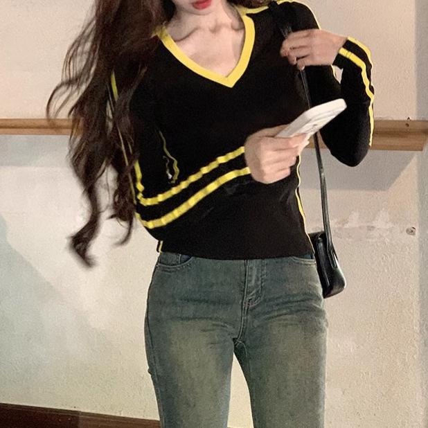 Tシャツ レディース Vネック 長袖 綿 織りテープ 切り替え 無地 トップス カットソー 韓国 カジュアル 白 黒 紺 青(x2)