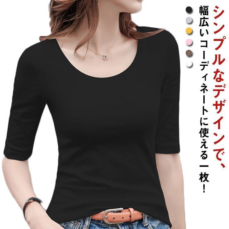 全6色 5分袖Tシャツ Tシャツ カットソー Uネック 春秋 夏 ストレッチ レディース トップス 綿 コットン 5分袖 タイト tシャツ 無地 スリ