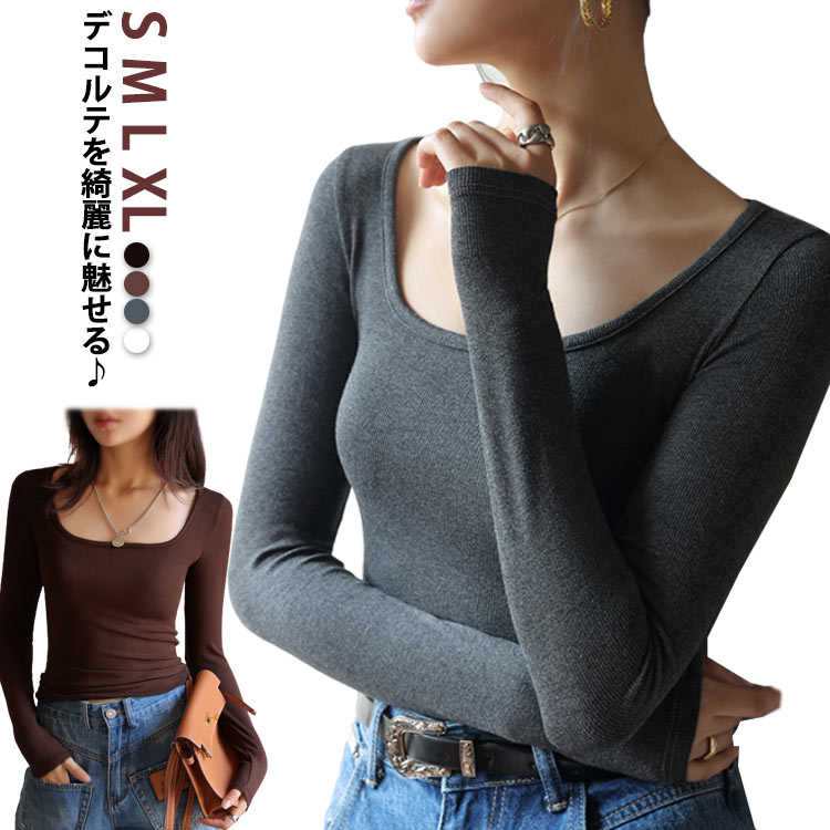 スリム 長袖 Tシャツ リブ カットソー Uネック レディース Uネック 細見え ロンT トップス 肌着 冬 カットソー 無地 秋冬 インナー 重ね着 スーツインナー オフィスカジュアル OL 長袖Tシャツ ストレッチ