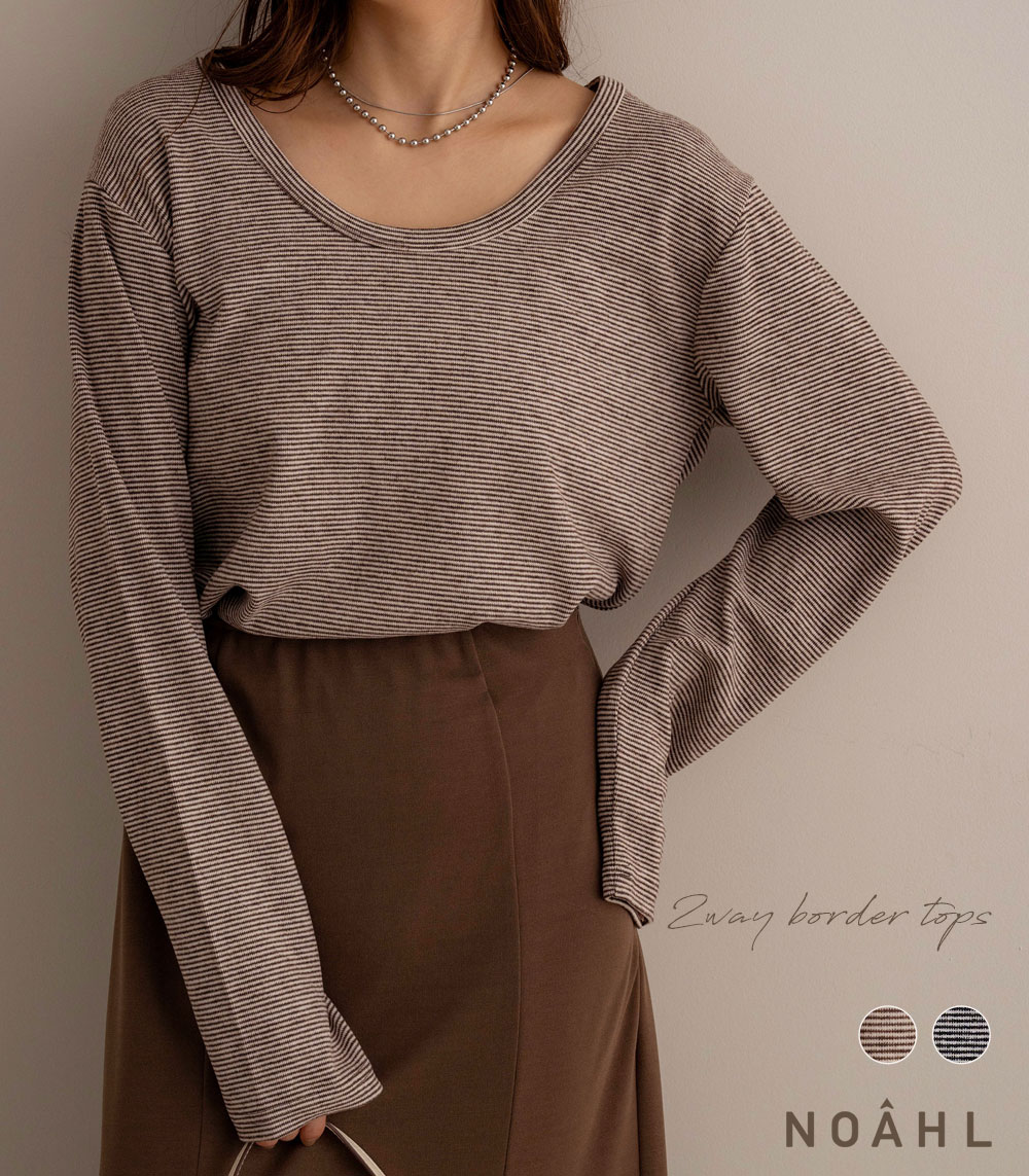 NOAHL|《3,888円→40%0FFクーポン利用》【メール便】前後 2way ボーダートップス ボーダー トップス レディース 長袖 ロンT Tシャツ Uネック ブラウン ブラック 秋 春 250924
