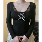 tシャツ 「Y2Kガーリー」レースVネックリボン付きロングスリーブトップス レディース