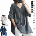 シャツ 綿麻 大きいサイズ 半袖Tシャツ Vネック ブラウス レディース 薄手 おしゃれ ナチュラル 無地 春夏 綿麻風 カジュアルシャツ Tシャツ トップス 無地Tシャ