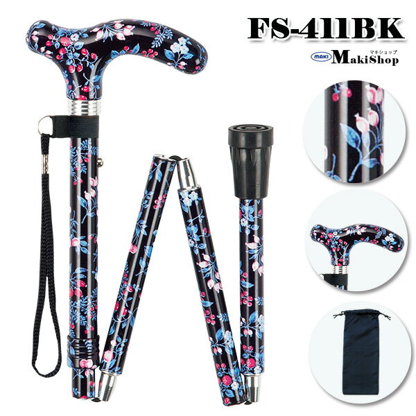 2%OFFクーポン 11/20 23:59まで ステッキ 杖 介護用品 折りたたみ 総柄 おしゃれ かわいい 上品 伸縮 折りたたみ カラフル 先ゴム マキテック FS-411BK(黒花柄) 敬老の日 プレゼント 孫 祖母