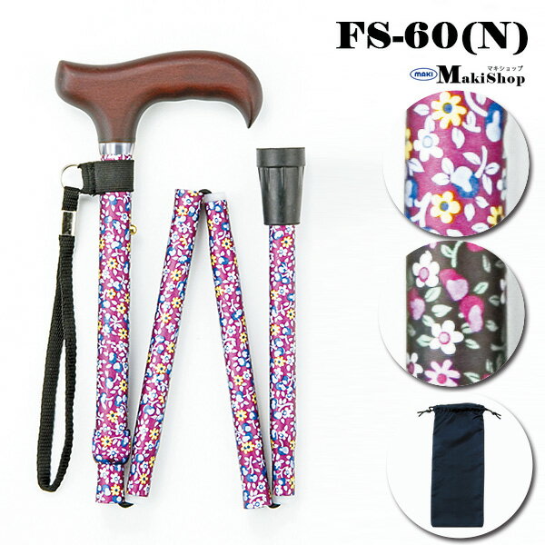 2%OFFクーポン 11/20 23:59まで ステッキ 杖 介護用品 折りたたみ おしゃれ かわいい 細身 伸縮 カラフル 先ゴム マキテック FS-60RE(N) 赤小花 FS-60BK(N) 黒小花 敬老の日 プレゼント 孫 祖母