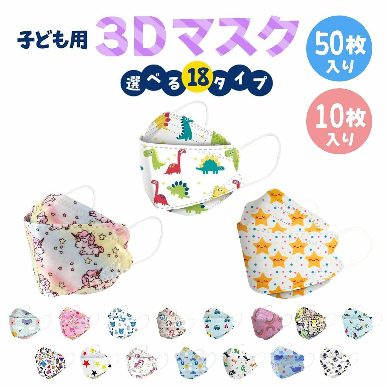 子供用 立体マスク 不織布 50枚 10枚 かわいい 3D ウイルス マスク mask カラー 全18種 携帯 キャラクター 使い捨て 恐竜 プリンセス 乗り物 女の子 男の子 衛生 送料無料 推し活 推し活グッズ