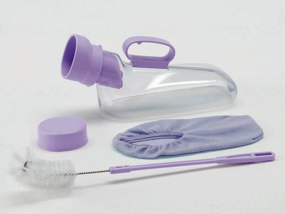 安寿 男性用尿瓶+尿器受けセット1200ml 目隠しカバー付 洗浄用ブラシ付きプラスチック製透明尿器 尿器ホルダー 尿瓶ケース メンズ 紳士用 大容量