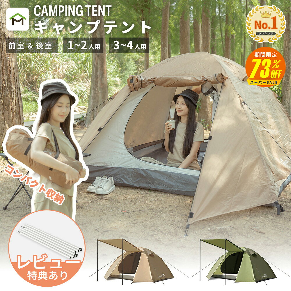 【着後レビュー特典】女性1人でも簡単設営 風に強いドーム型 前室&後室付き 小型収納デザイン 防虫&通気メッシュ構造 フルクローズ仕様 99.9%UVカット UPF50+ 4000mm耐水圧【1~2人用...