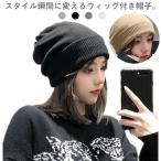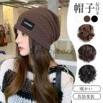 髪付き帽子 ウィッグ付き帽子 秋冬 ニット帽 レディース 毛付き かつら付き セミロング ストレート 一体型 帽子 ニットキャップ 小顔効果