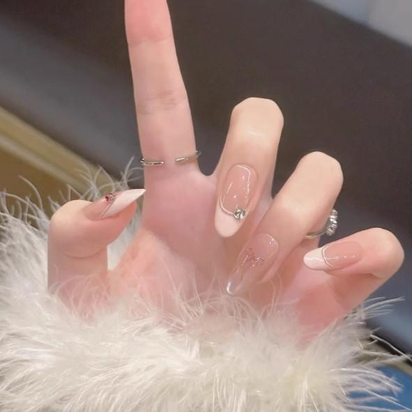 レディース ネイルチップ 手描き 蝶結び 輝き ホワイトニング 猫目 デザイン 超薄 無痕 透け感 甘め フレンチ シンプル インスピレーション スタイル 椭円型 中型 短型 長型 ピンク ブラック ナチュラル かわいい 指先美 手元アクセサリー