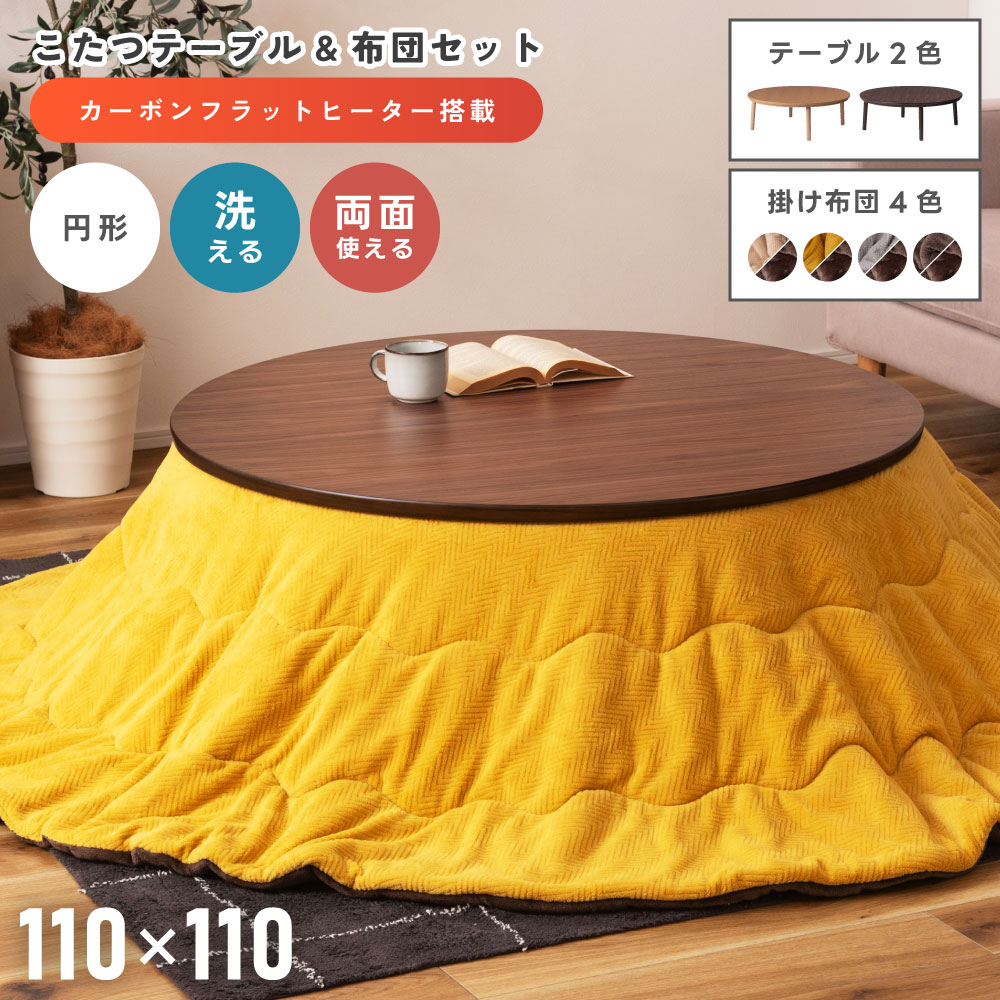 こたつセット 丸テーブル 円形テーブル 直径110cm 丸い フラットヒーター カーボンヒーター 国内メーカー 保証付き 薄型 薄い 北欧 木製 天然木 アッシュ ウォルナット ウォールナット 丸脚 6人用 リビング モダン ナチュラル ブラウン