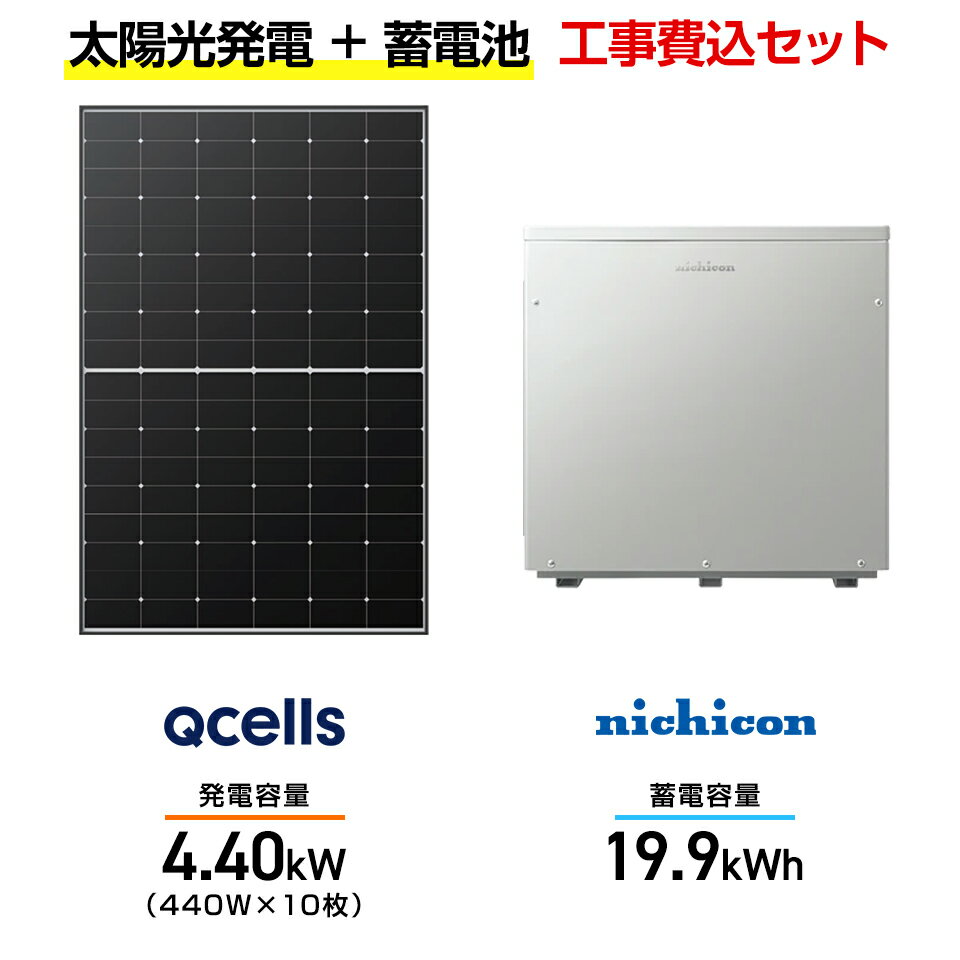 【住宅用】太陽光発電 4.40kw+蓄電池 19.9kWh 工事込セット Qセルズ Re.RISE-G3 440W×10枚・ニチコン トライブリッド ESS-T5Z1 19.9kWh・トライブリッドパワコン 9.9kw