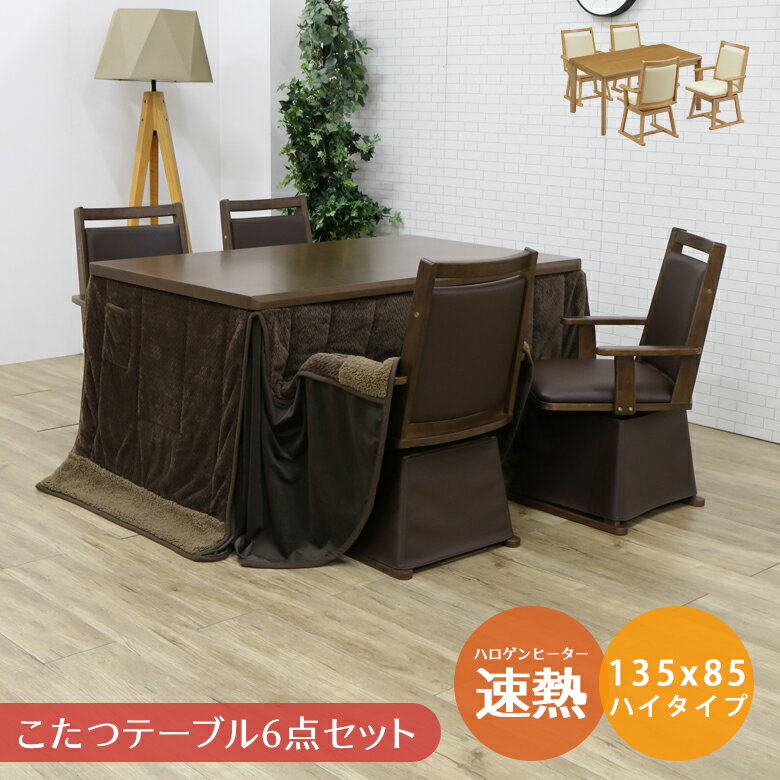 【全商品に使える2%offクーポンあり!!】 こたつ セット こたつ布団 4人用 ハイタイプ こたつ6点セット 4人掛け 長方形 ダイニングこたつセット 135cm 幅135 炬燵 コタツ 布団セット チェア4脚 回転式 PVC 合成皮革 ハロゲンヒーター 収納ポケット
