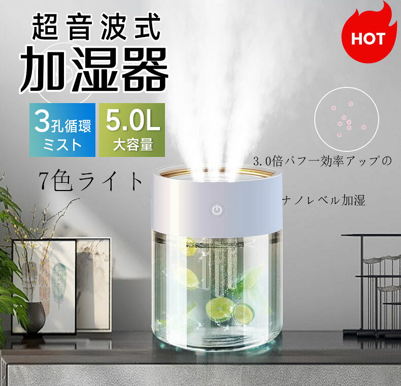 大特価2980円 加湿器 超音波式 大容量 5L 30時間連続加湿 4段階調節 省エネ 加湿機 上部給水 空焚き防止 360°調整噴霧口 LEDライト付き 静音 タイマー機能