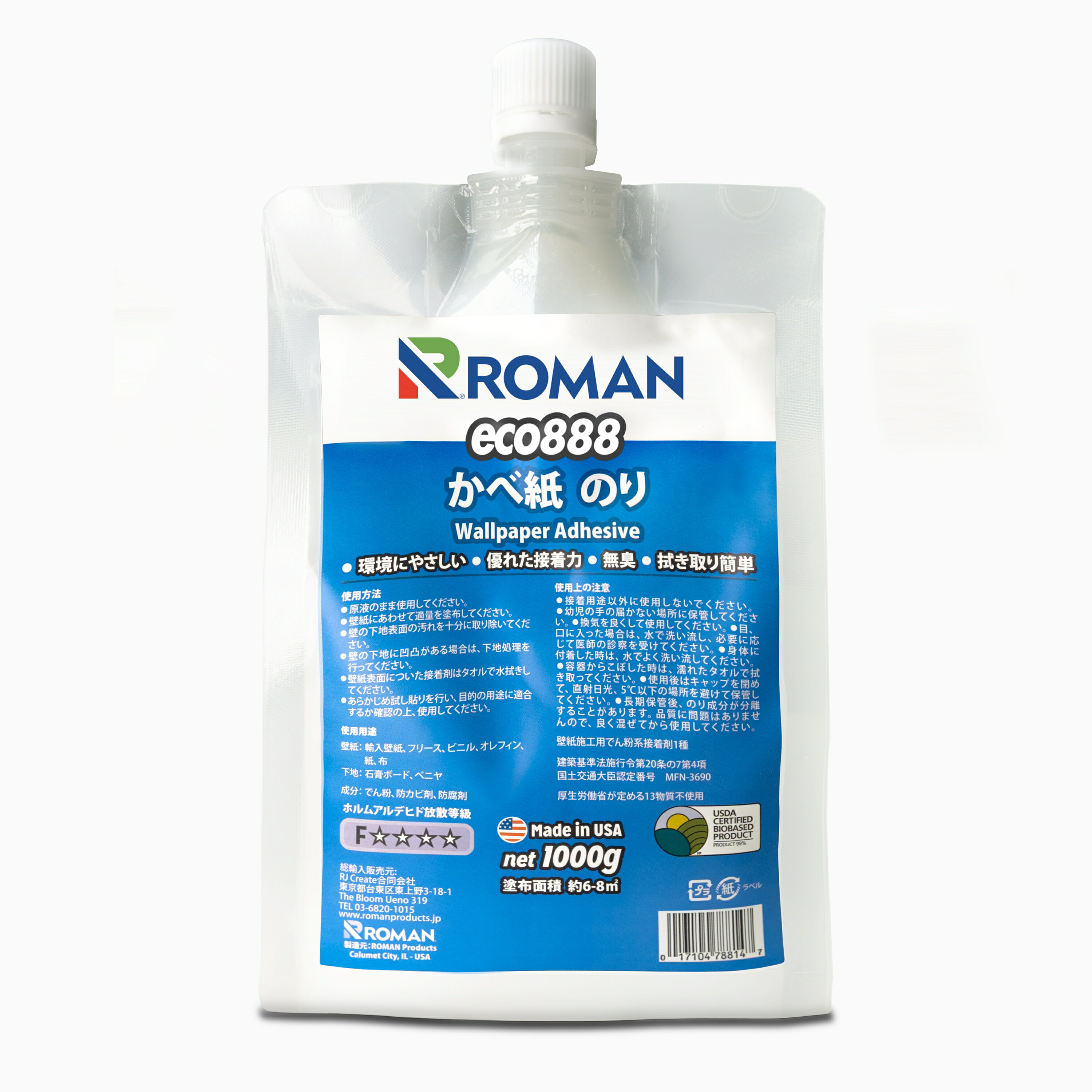 壁紙用のり ECO-888 1kg 壁紙専用接着剤 米国農務省バイオベース認定 天然素材99% ホルムアルデヒド放散 F★★★★ 壁紙 のり 接着剤 クロス用のり 壁紙補修 DIY 簡単リフォーム きれいに貼れる 水溶性 防カビ剤配合