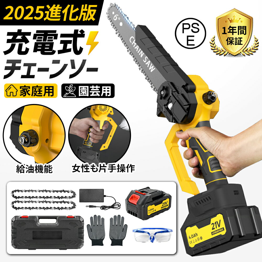【オープン記念!5%OFFクーポン・10/24まで】充電式チェーンソー 6インチ 充電式ハンディソー 充電式チェンソー コードレス 電動チェーンソー 小型チェーンソー 家庭用 電動ノコギリ 21Vバッテリー 切断直径150mm PSE認証 1年保証 ブラシレスモーター ハンディチェーンソー