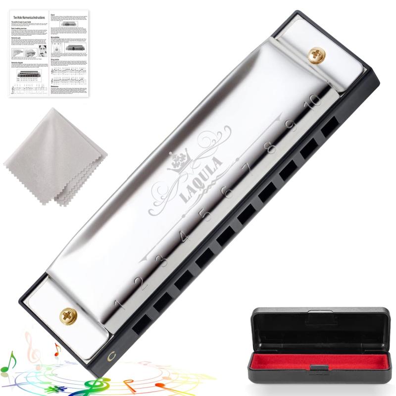 ハーモニカ ダイアトニック 10ホール C調 初心者 上級者 高気密性ブルースハープ ケース、ポリッシングクロス、教則付 (ぎんいろ)