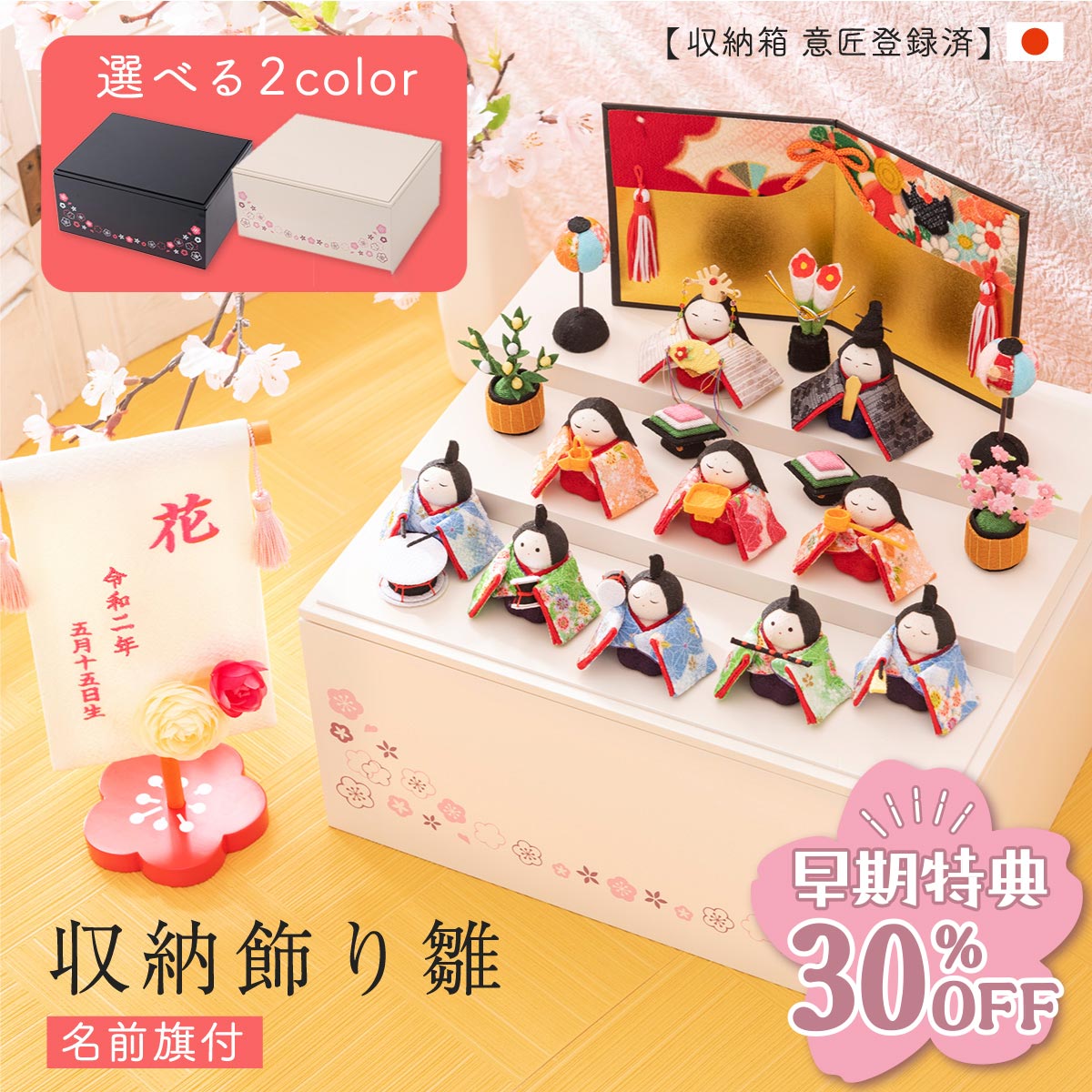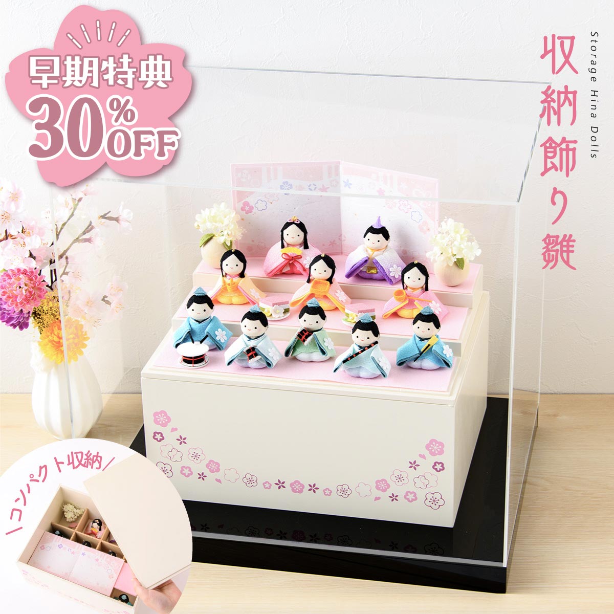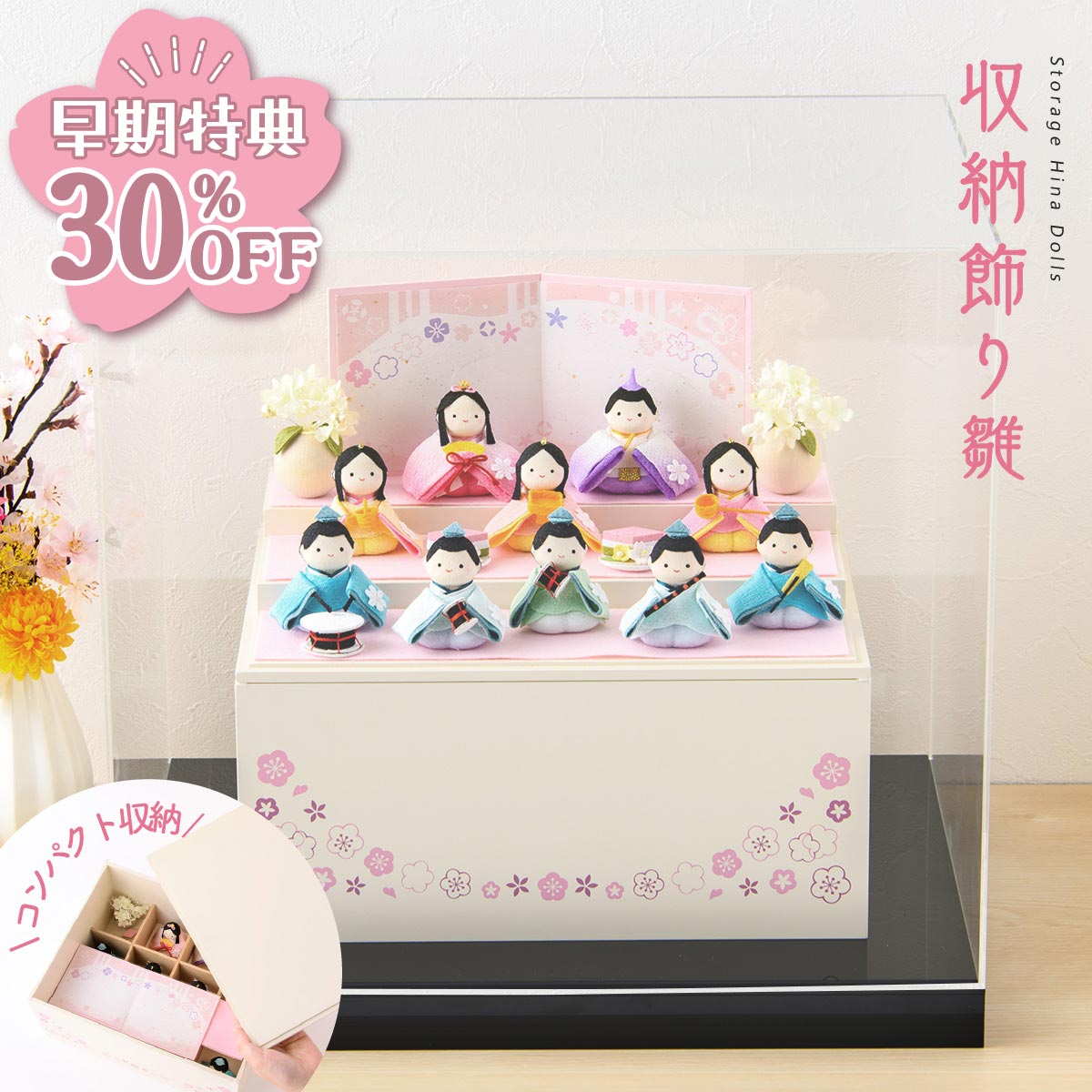 【早期特典!! 30%OFF★12/1 正午まで】雛人形 新作 コンパクト ケース飾り モダン おしゃれ かわいい お雛様 ミニ サイズ ひな人形 収納飾り 木製収納ケース 人形 収納飾り 三段 ちりめん さくら 名前旗付き 刺繍 アクリルケース 10人飾り 雛祭り 龍虎堂 リュウコドウ