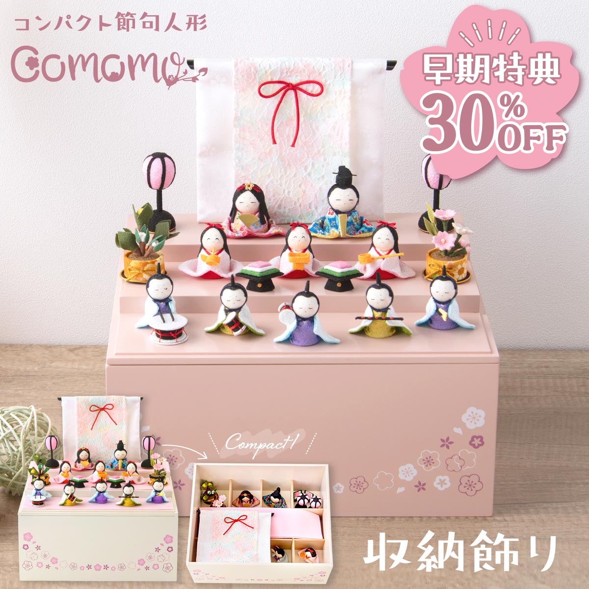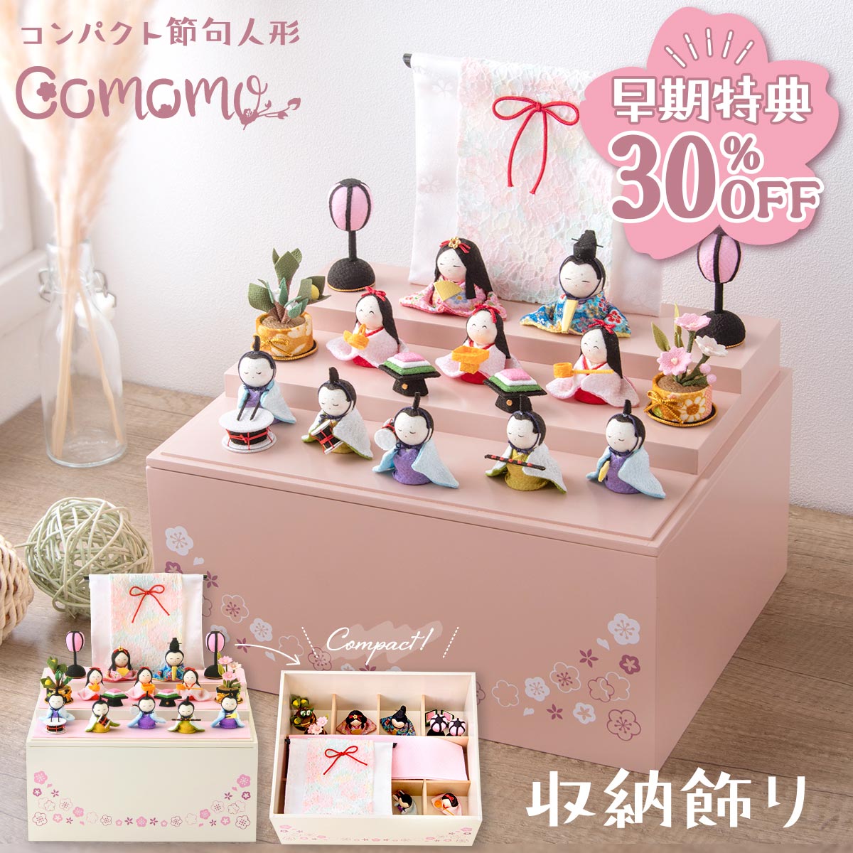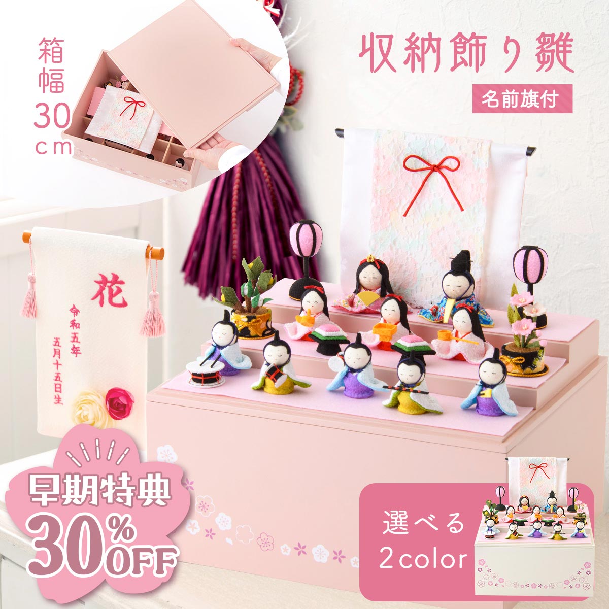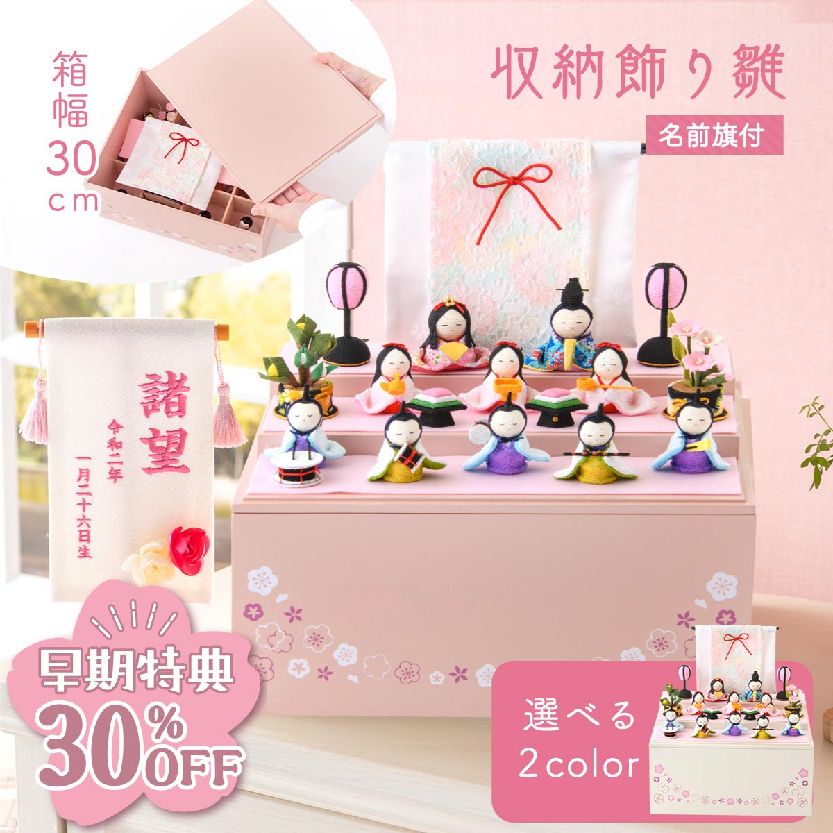 【早期特典!! 30%OFF★12/1 正午まで】雛人形 新作 コンパクト ケース飾り モダン おしゃれ かわいい お雛様 ミニ サイズ ひな人形 収納飾り 木製収納ケース 人形 収納飾り 三段 ちりめん さくら 名前旗付き 刺繍 アクリルケース 10人飾り 雛祭り 龍虎堂 リュウコドウ