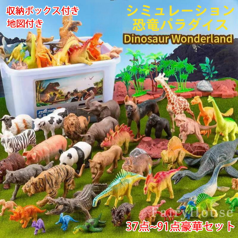 【6%OFFクーポン】豪華91点セット 恐竜 フィギュア おもちゃ 人形 ティラノサウルス フィギュア 誕生日 プレゼント 収納ボックス付き リアル 子供 キッズ 肉食恐竜 おもちゃ 迫力 知育玩具 恐竜 動物の世界セット 収納ケーズ付 地図付き 動物認知 ギフト 子供日 クリスマス