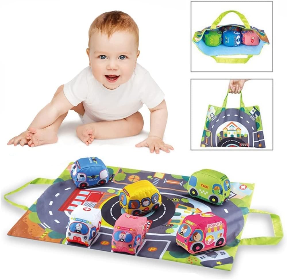 【材料、塗料安全検査済】 誕生日 プレゼント あかちゃん 赤ちゃん 布製 ミニカー おもちゃ 玩具 収納袋付き 車 布 男の子 女の子 1歳 2歳 3歳 知育玩具 プレイマット 出産祝い くるま