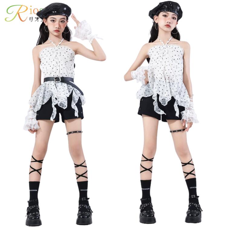 キッズダンス 女の子 セットアップ 白 水玉 ドット柄 キャミソール 黒 短パン おしゃれ キッズダンス衣装 白 ダンス衣装 キッズ 韓国 K-pop 練習着 110-180