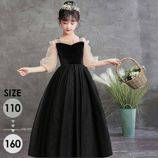 ピアノ発表会 ドレス 中学生 ワンピース ジュニアドレス 七五三 キッズ ドレス パーティー 五分袖 お姫様 ロング丈 エレガント 透け感 キャミソールドレス 子供ドレス ファスナータイプ 女の子 ロング丈 フォーマル Aライン ステージ衣装 キャミソール ブラック 140 150 160