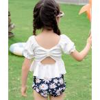 水着 「キッズ水着/裏地付き」半袖 バック リボン カットアウト パフスリーブ リブ ペプラムトップス+フリルショーツ+スイムキャップ 上下3点セット