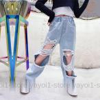 キッズ ロングパンツ ワイドパンツ ガウチョパンツ 女の子 ダメージ ジーンズ ジーパン ウエストゴム カジュアル ズボン ボトムス ガールズ 女児 ジュニア