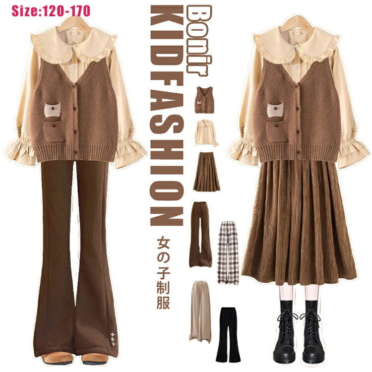 フォーマル キッズ 女の子 ベルボトム ベージュ ブラウン ベスト パンツ ブラウス スカート 長袖 セーター ズボン フレアパンツ キッズ オシャレ 春秋 お受験 面接 子供スーツ 上下 七五三 韓国風 子ども服 入学式 お受験 結婚式 発表会 120-170