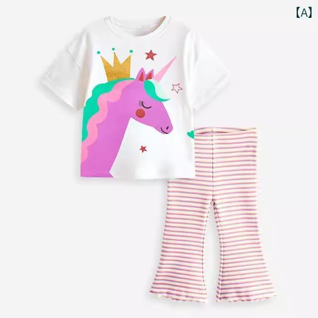 キッズ 女の子 半袖 セットアップ 夏 かわいい ユニコーン 子供用 ツーピース セット ポップ柄 アメリカ プリント ベルボトムパンツ
