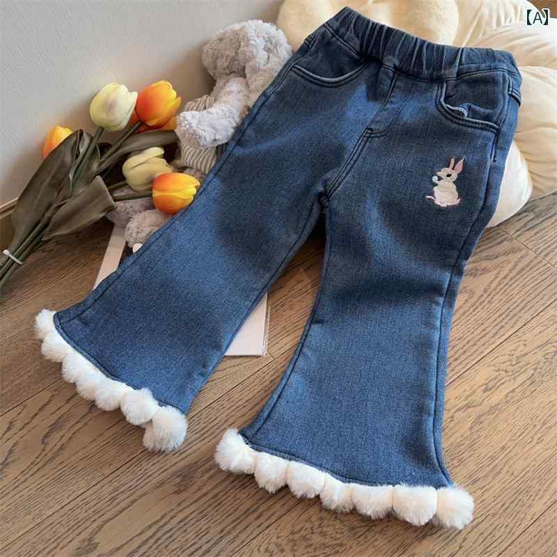 子供服 女の子 キッズ かわいい おしゃれ フリース ジーンズ 秋冬 刺繍 バニー ファー レース カジュアル ベルボトムパンツ 小