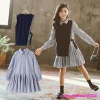 子供服 セットアップ キッズ 女の子 春秋 長袖 2点セット 上下セット トップス ベスト シャツワンピース ストライプ ジュニア おしゃれ 可愛い 新品 150cm 160cm