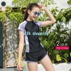 水着 上下セット セパレート ジュニア レディース キッズ スイムウエア フロントジッパー 半袖 袖あり パッド付き ショートパンツ ラッシュガード