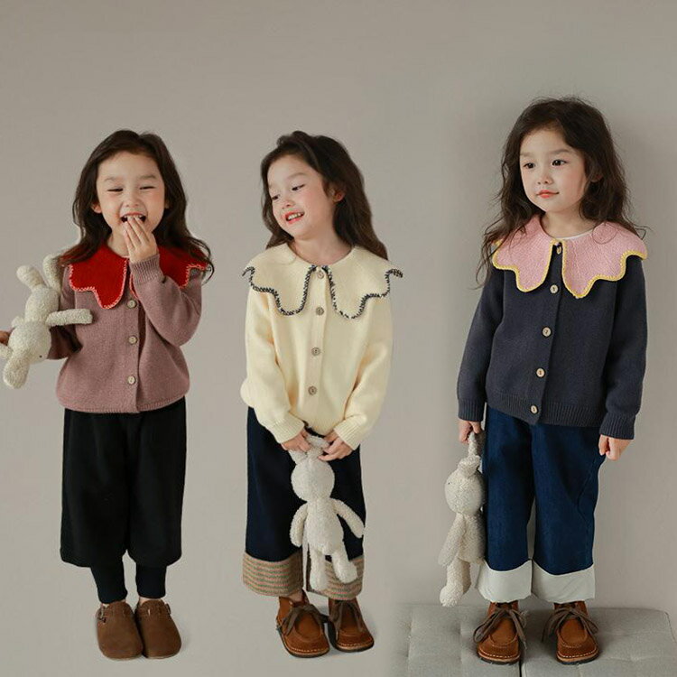 子供 セーター 前開きセーター 可愛い 蝶結び 女の子 キッズ ニットセーター ニット 長袖 無地ニット 上着 トップス ジュニア 韓国こども服 秋冬服