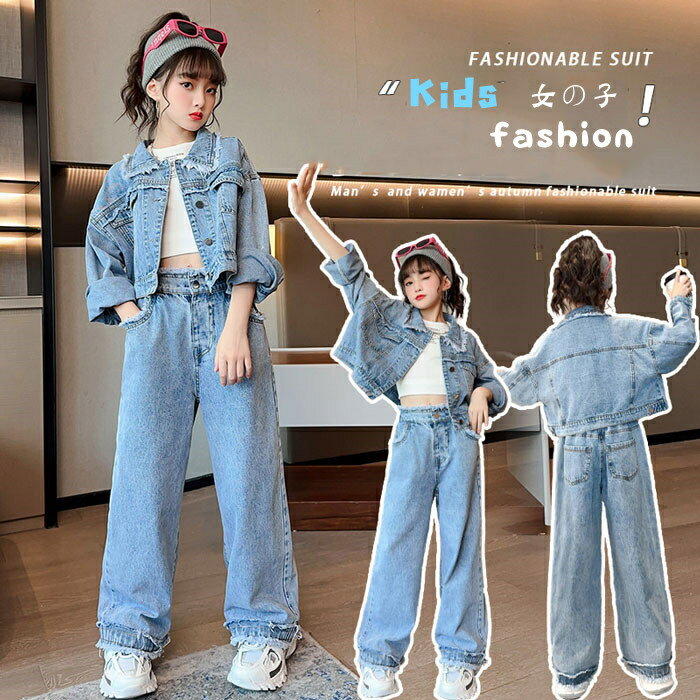 子供服 セットアップ 女の子 春秋 長袖 デニムセットアップ ジャケット ロングパンツ 上下セット 普通着 ジーンズ デニムパンツ デニムセット パンツセット 学生 カジュアル ジュニア服 体育祭 部屋着 普段着 通学着 小学生 中学生 おしゃれ 120/130/140/150/160/170cm
